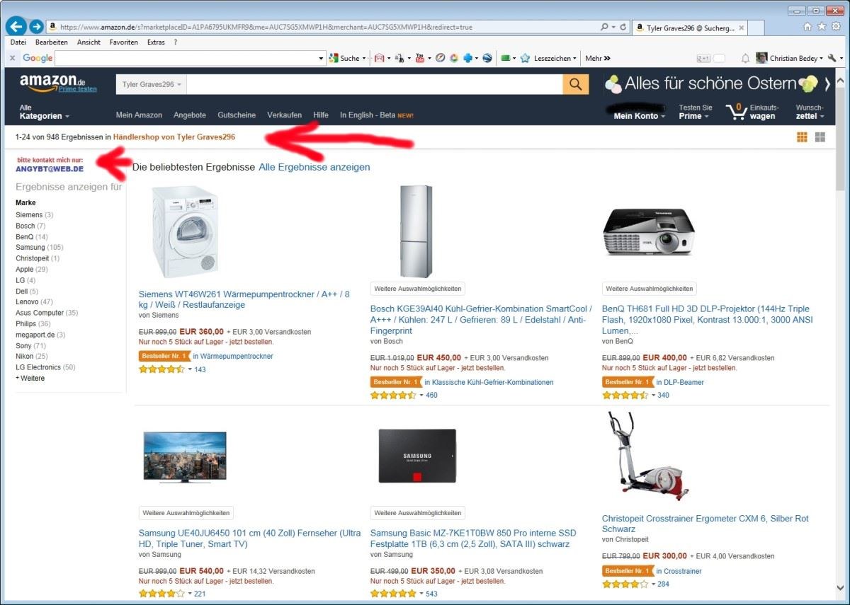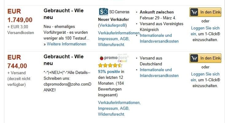 Schnäppchen gefällig, aber gern doch! Nur preiswert ist nicht immer günstig, wie man am folgenden Beispiel sieht. Schon seit Wochen tauchen bei Amazon immer wieder Verkäufer auf, die Neuware aus allen Bereichen besonders günstig anbieten. Häufig mit Nachlässen bis zu 70 % gegenüber dem Neupreis. Bei Interesse wird Ihnen nahe gelegt, den Verkäufer per E-Mail zu kontaktieren. Dann werden Sie "belabert", den Kaufpreis über einen gefakten Amazon Zahldienst (natürlich erhlaten Sie auch eine Rechnung!!) zu bezahlen. Das Geld landet dann in allen Fällen auf ausländischen Konten, weit weg von Ihrem Zugriff. Ware gibt es keine !!!!!!