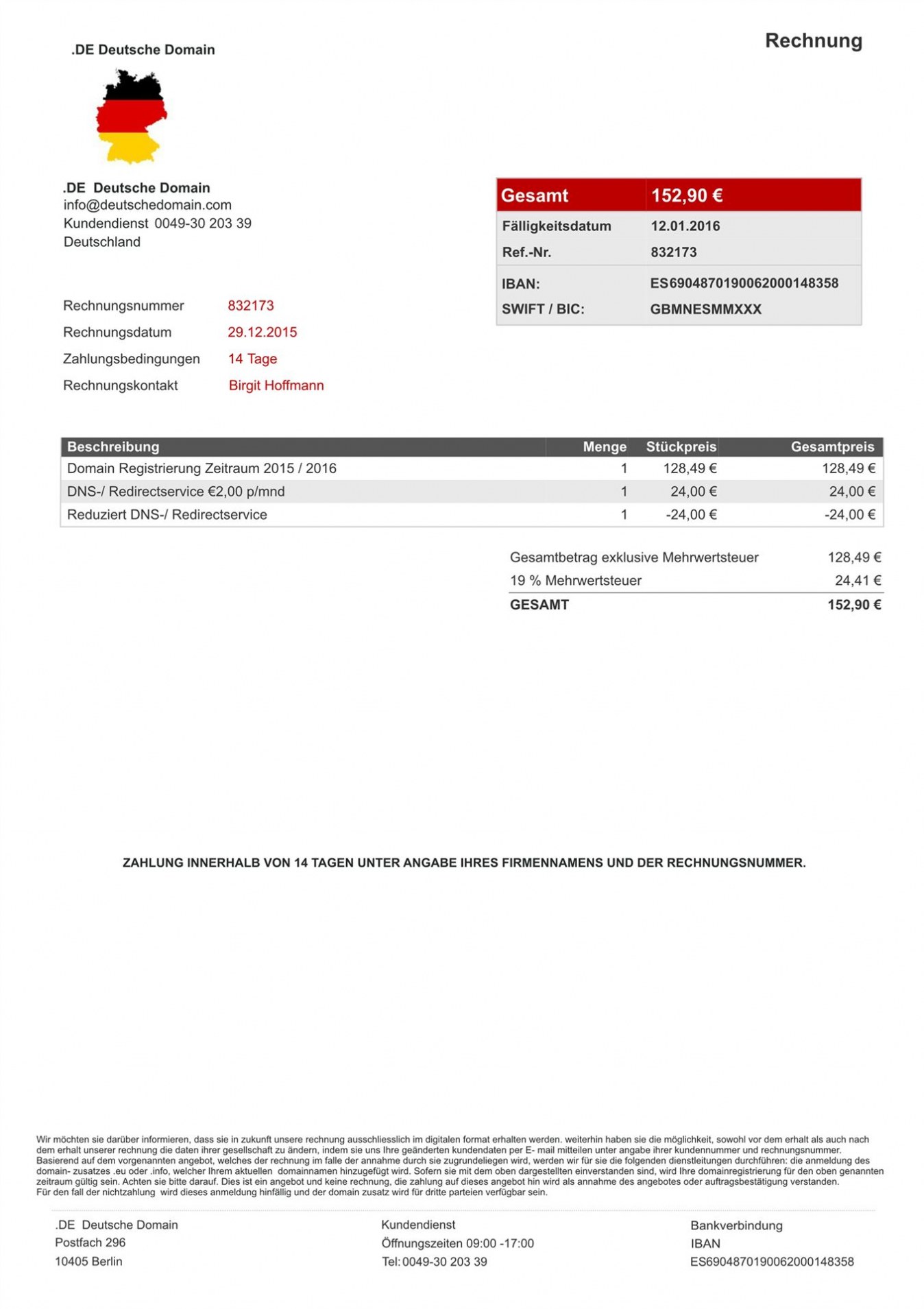 Derzeit erhalten zahlreiche Internetnutzer per E-Mail vermeintliche Rechnungen der „DE Deutsche Domain”. Sie werden aufgefordert 152,90 EUR für eine nicht bestellte Domain-Registrierung zu zahlen. Keine dieser Rechnungen entspricht dem deutschem Recht. Es sind weder Rechnungsempfänger noch Rechnungsteller im erforderlichen Umfang auf der Rechnung enthalten. Allein dieser Umstand entlarvt die Rechnung als Betrugsversuch. Auch die E-Mail entlarvt die Absicht. Man wird mit „Sehr geehrte Frau / Herr“ angeschrieben. Die angegebene Domain „deutschedomain.com“ ist über die Firma Domains By Proxy, LLC (Arizona) registriert. Das heißt, man bekommt den wirklichen Domaininhaber nicht bzw. nur sehr schwer heraus. Auch in der E-Mail selbst fehlen sämtliche Pflichtangaben. Wer zahlt, dessen Geld landet in Spanien!